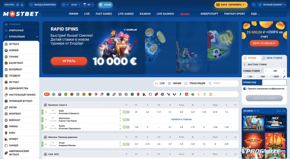 Центральная часть главной страницы отведена под блок Live-ставок, где можно заключать пари на актуальные спортивные события в режиме реального времени. Ассортимент впечатляет: футбол, теннис, баскетбол, хоккей, регби, крикет, единоборства, бокс, футзал и десятки других дисциплин. Над блоком размещён удобный слайдер с афишей ближайших матчей, турниров и акций, включая фриспины и бонусы казино.